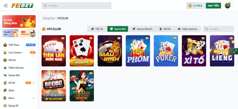 FEBET mang đến nhiều tựa game bài từ truyền thống như Liêng, Phỏm đến hiện đại như Poker và Baccarat, đáp ứng mọi nhu cầu giải trí của người chơi.