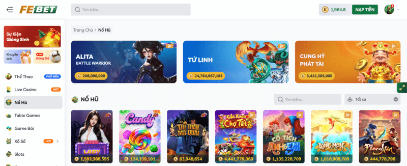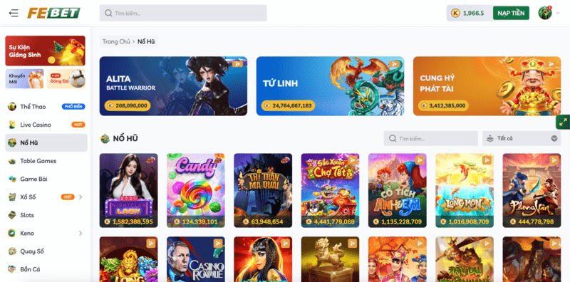 FEBET cung cấp nhiều trò chơi nổ hũ đa dạng như Tứ Linh, Cung Hỷ Phát Tài, và Alita Battle Warrior. Bạn chỉ cần chọn trò chơi phù hợp và bắt đầu trải nghiệm.